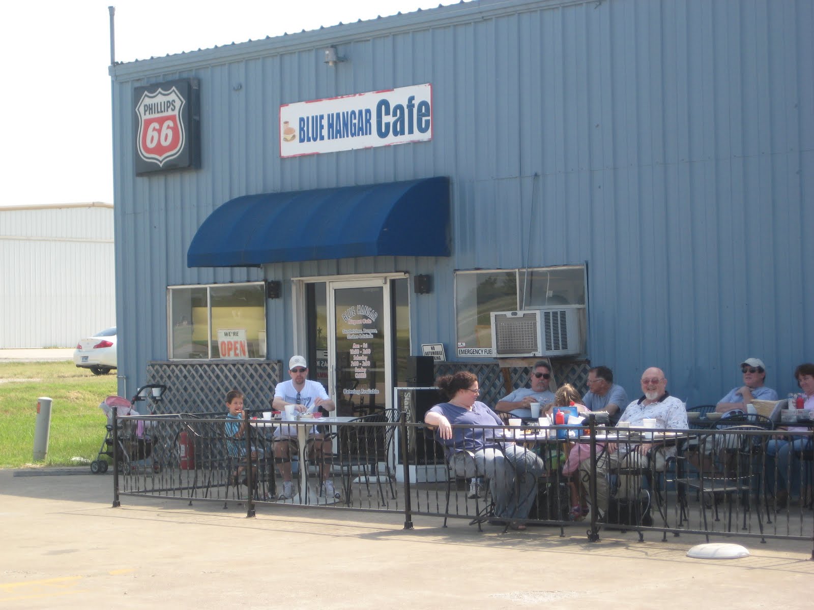 We recently visited a neat, unique, hole-in-the-wall restaurant called the Blue Hangar Cafe. Located in Roanoke, TX (just a few miles west of our home in Highland Village), it is a small regional airport where little planes land and take off. We went for breakfast (only served on Saturdays) because we heard they had yummy, cheap pancakes (this was confirmed by my stomach and my bank account). We still need to try their burgers for lunch sometime, so we hope to get out there again maybe once the weather cools off a little!